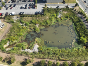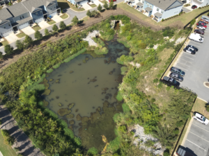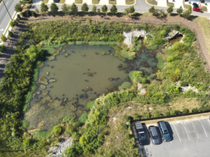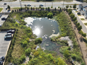 The first image shows the retention pond from a wide aerial perspective, highlighting its full layout, including surrounding vegetation and nearby infrastructure.